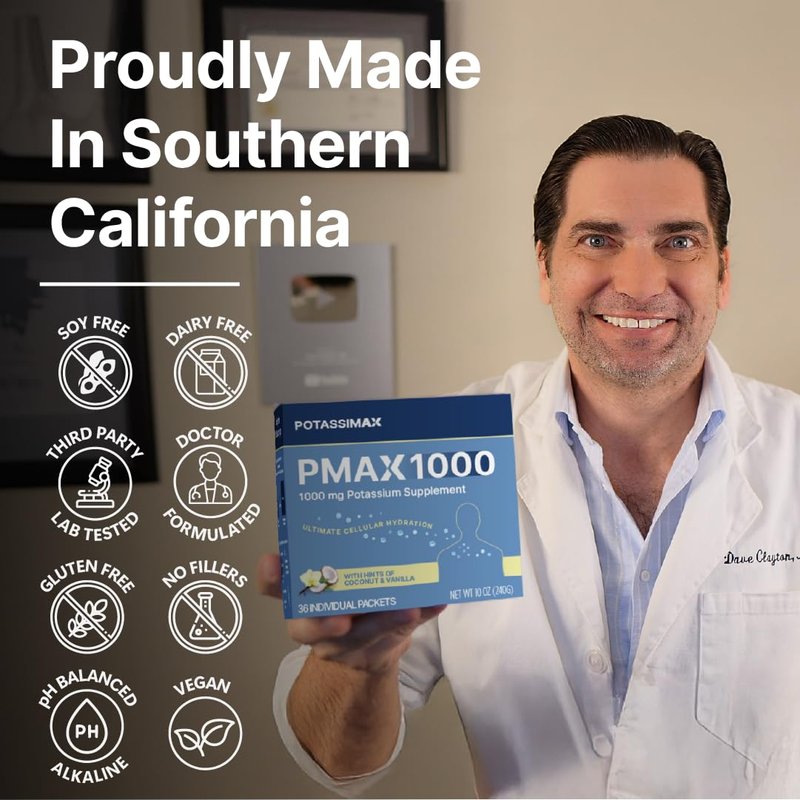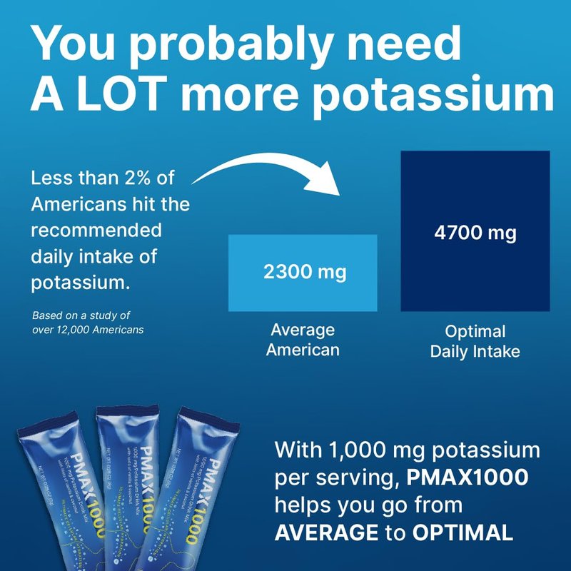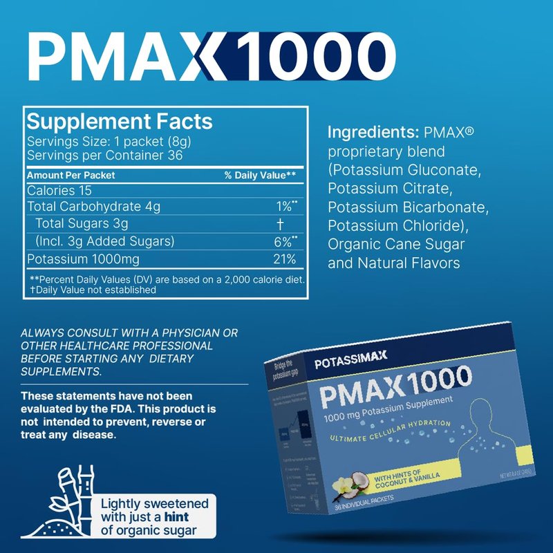 PMAX1000 Potassium Supplement Powder 1000mg, High Dose 4-Type Potassium Blend with Citrate, Chloride, Gluconate & Bicarbonate, Electrolyte, Kidney & Heart Support Supplement (36 Travel-Ready Packets)