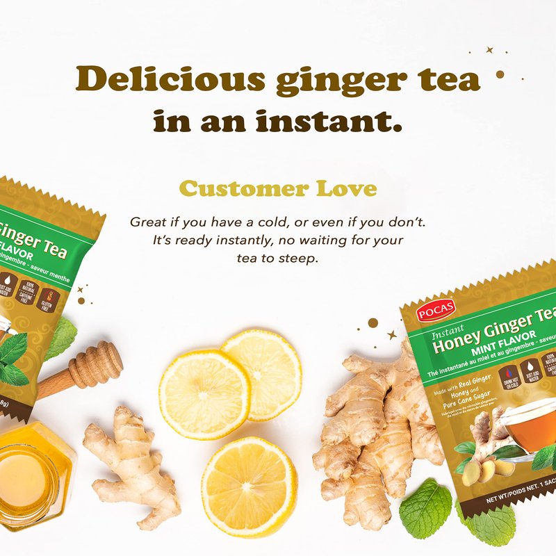 - POCAS HONEY GINGER TEA CRYSTALS WITH MINT EXTRACT: Enjoy a delicious and comforting cup of our honey ginger tea from an instant tea powder that melts in hot or cold water.