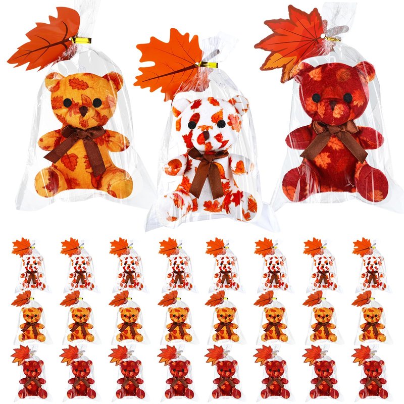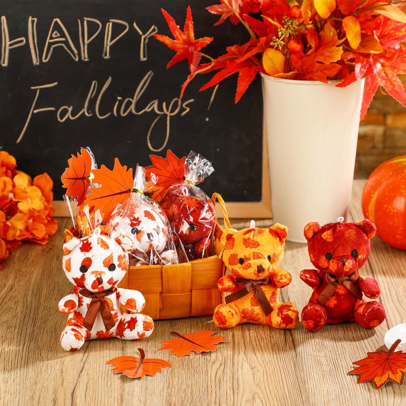 - Fall Exchange Prize Gifts Set: you will get 27 sets kids fall classroom school exchange prize gifts, including 27 mini fall style plush bears in 3 styles, orange maple leaves pattern, yellow maple leaves pattern, and white maple leaves pattern, 27 maple leaves cards, 27 cellophane bags and 27 metallic twist ties, all these mini stuffed animal bears with cards are suitable for kids to exchange gifts in classroom or school