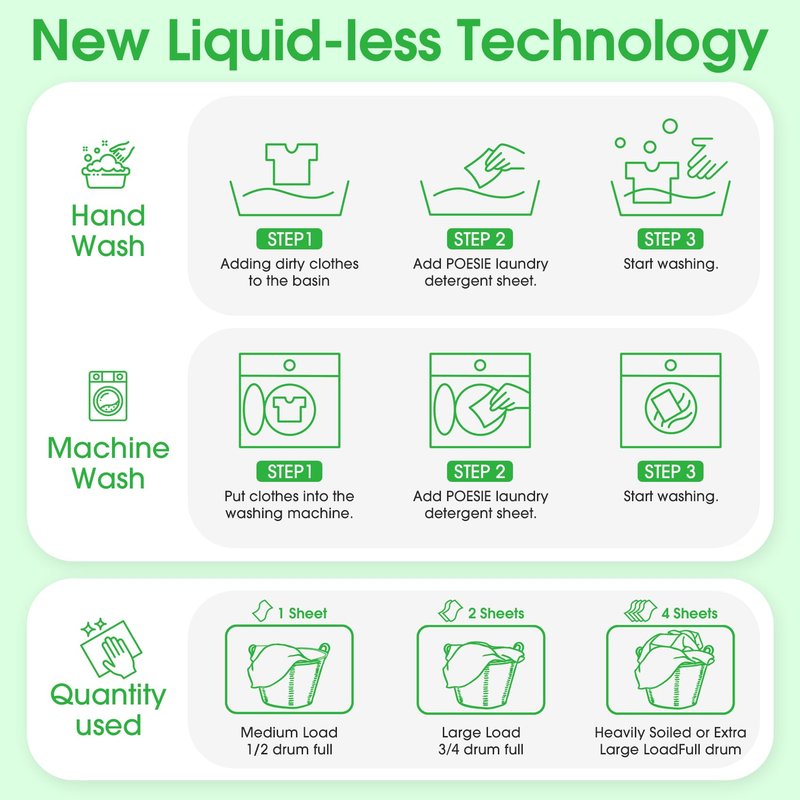 - Easier to Use - Liquid-free detergent sheets, 1 sheet for small or medium loads where clothes are not very dirty, 2 sheets for large loads and 4 sheets for extra large loads, no waste. Not too little and not too much to save resources