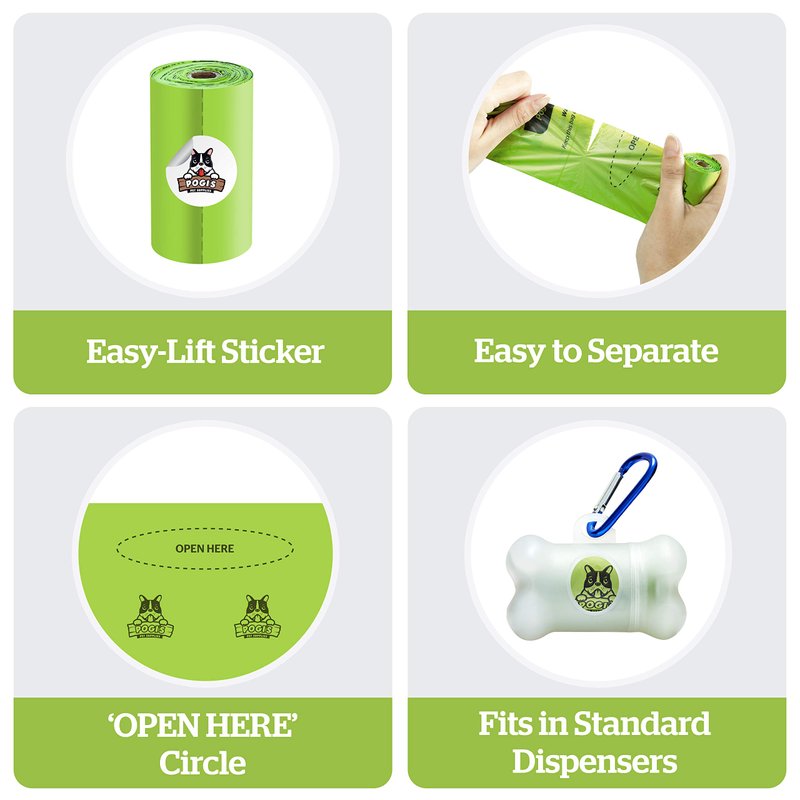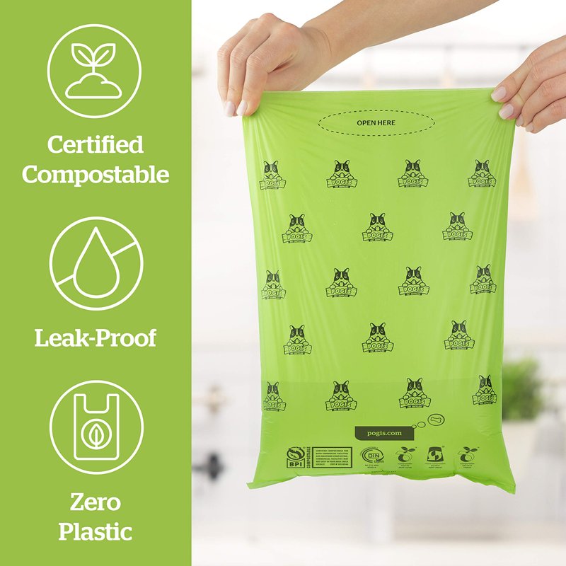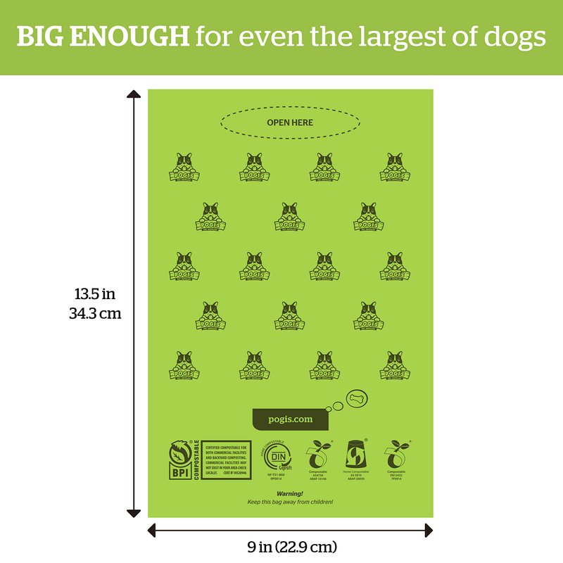 First and foremost, a poop bag needs to get the job done. Pogi's Compostable Dog Poop Bags are extra large, leak-proof, and plant-based so you never have to worry about clean-up getting messy, even with larger breeds. Our popular dog waste bags are also plant-based, so you get bonus points for lessening your carbon pawprint.