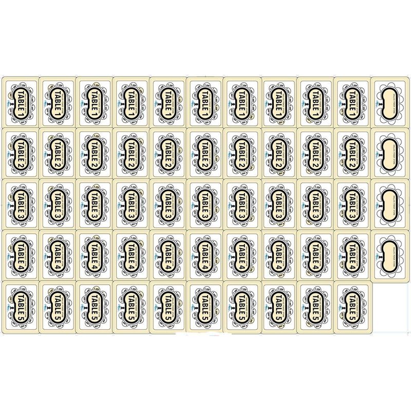 Covers up to 5 tables of 10 players each. Also comes with 4 blank cards for extras.