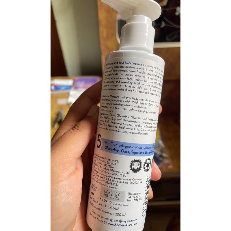 Wish'Care 10% AHA + 1% BHA Body Lotion - Smooths Rough & Bumpy Skin - Glycolic & Lactic Acid Body Lotion with Niacinamide - 200 Ml - 6.76 Fl Oz Directions: Massage it all over body until absorbed. Best to be applied at night. For daytime, follow it up with our SPF50 Sunscreen Body Lotion. Do not apply to just-shaved or wounded skin.