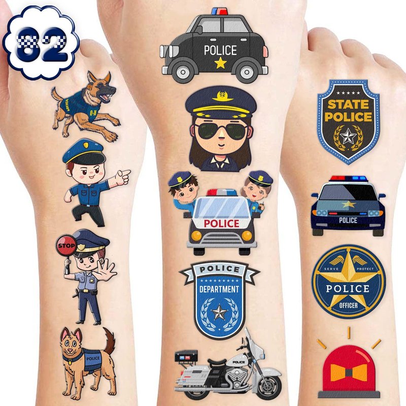👮KIDS POLICE: Hey there! You'll be receiving an awesome set of 8 sheets of POLICE temporary tattoos with 82 pieces. Isn't that amazing? You'll have plenty to use daily, replace, or even share with your friends and family. So get ready to show off your unique style and have some fun with these cool tattoos! 🚔POLICE PARTY DECORATIONS: POLICE tattoo stickers are suitable for POLICE party decorations for kids who love police,specially for POLICE themed birthday party, show themed party, graduation party, kids play party, POLICE retirement party.It is the darling of the POLICE car theme birthday party and is loved by POLICE decorations party. ♻️SAFE AND HIGH QUALITY: We create temporary tattoos using high-quality, eco-friendly paper that is safe to use. Our tattoos are visually appealing and made with utmost care for our clients' safety. 📌USAGE: Before removing the tattoo, it's essential to take off the clear paper from the sheet. You can choose any covered surface like your arms, hands, face, or objects like a water bottle, purse, laptop, or phone case to apply the product. Wait 20 to 30 seconds, sprinkle a few drops of water on the tattoo, and remove the backing paper. You'll have a gorgeous, velvety tattoo that can be easily removed with baby oil, soap, or water. Go ahead and enjoy your stunning new look! 💌CUSTOMER SERVICE: If you have sensitive skin, we advise against using this product. In case of any symptoms, please stop using it immediately. Our team is always here to help and make sure you have a positive shopping experience. Please do not hesitate to contact us for assistance.