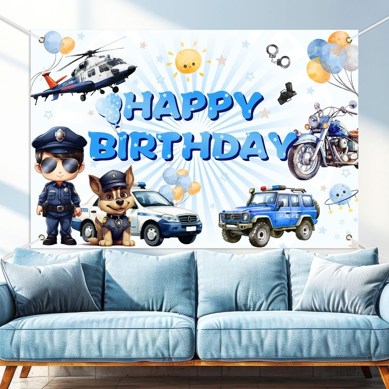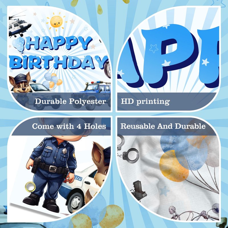 - Suitable scene:This little policeman birthday decoration is perfect for decorating your police-themed birthday party, and other cosplay theme birthday events. This cartoon police background is full of various police-related elements, such as police, police dogs, helicopters, police cars, etc. You can hang it on the wall, door, fireplace, or anywhere you want. It will add the perfect touch to your birthday party and will surely impress everyone.