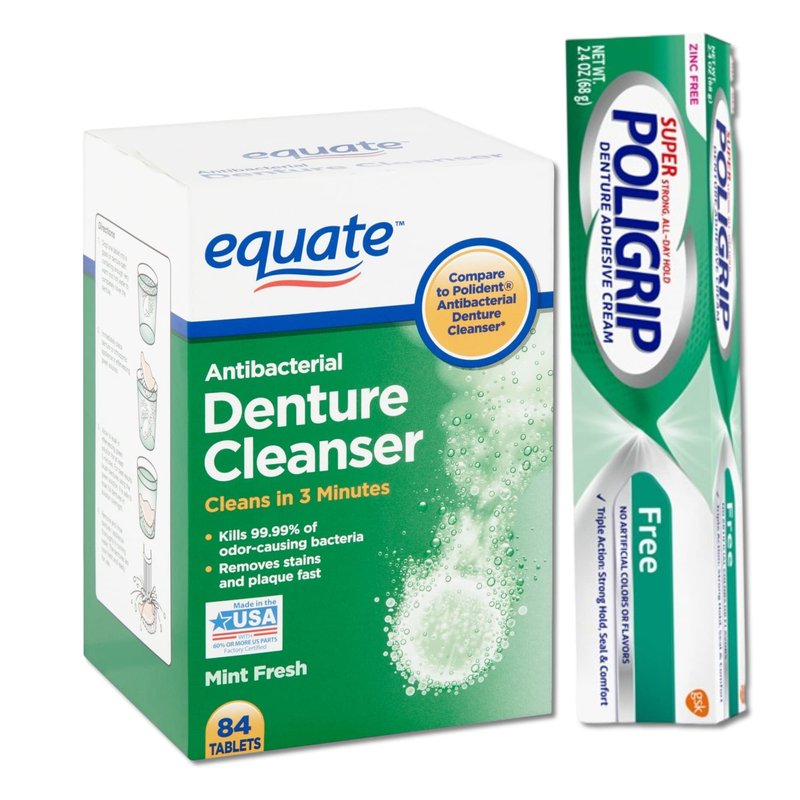 - ⭐ BUNDLE CONSISTS : One Boxes of 84 EQUATE 3 Mintues Denture Cleaner and One box of Super Poligrip Zinc Free Denture Adhesive Cream, 2.4-ounce Tubes