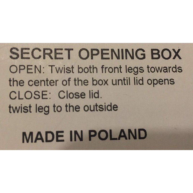 This trick box is decorated with a Claddaugh pattern over a shamrock on the lid and a band of shamrocks around the base. Rotate the two front feet to unlock the lid and open.
