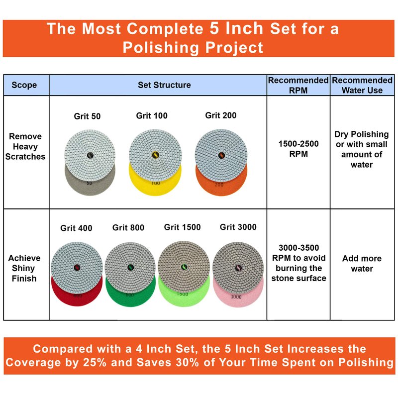 Our set was designed to offer the most complete 5 Inch granite polishing kit at a very competitive price while keeping the quality at the highest.