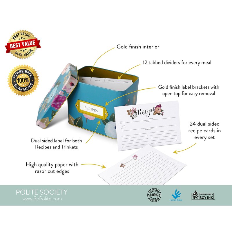 - WHIMSICAL GIFTS - Polite Society prides themselves on creating thoughtful, whimsical gifts for loved ones of all ages. Our blue recipe box makes a great Christmas, housewarming or birthday gift for any loved one in your life