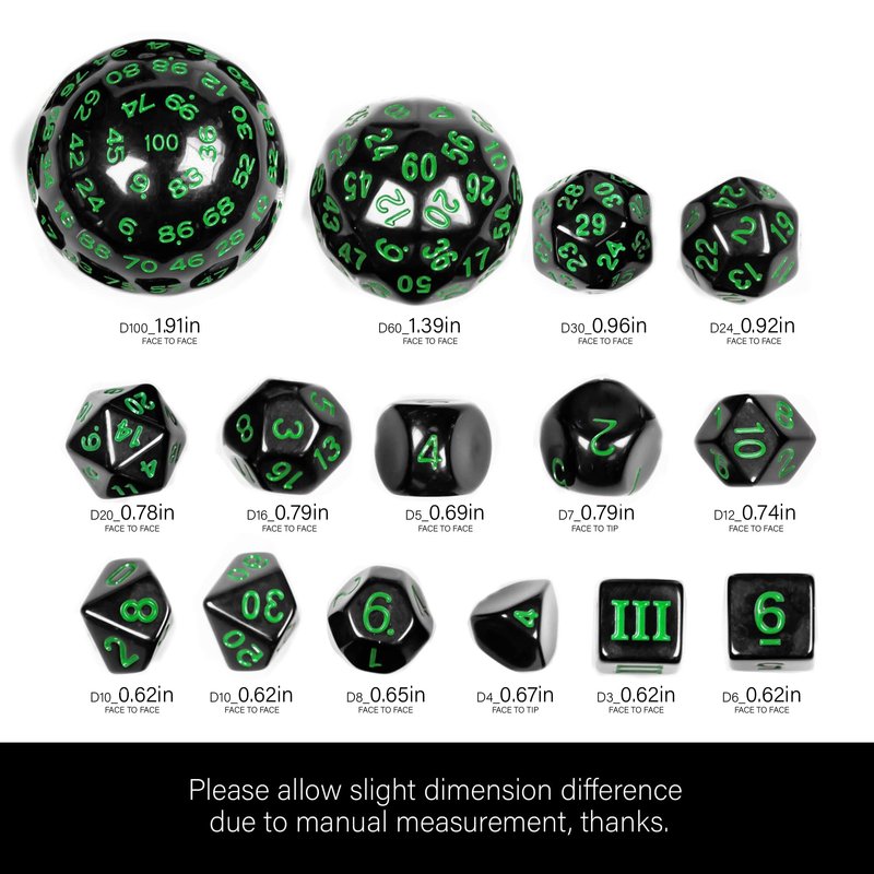 Poludie 15 Pieces Complete Polyhedral DND Dice Set D3-D100 Spherical D&D Dice Set with Dragon Eye Dice Bag, D100 Dice for Dungeons and Dragons, RPG, MTG Table Games(Black w/Green Numbers)
