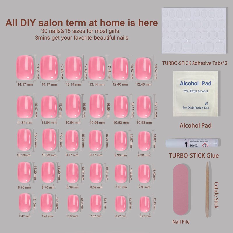 - ๐ฃ๐ฎ๐ฐ๐ธ๐ฎ๐ด๐ฒ ๐๐ผ๐ป๐๐ฒ๐ป๐๐๏ผPress on nails stick kit contain 30PCS, 15 sizes of acrylic nails to meet the different nails, jelly glue, liquid glue, nail file, cuticle stick, prep pad, exquisite and compact false nails package by any travel plan