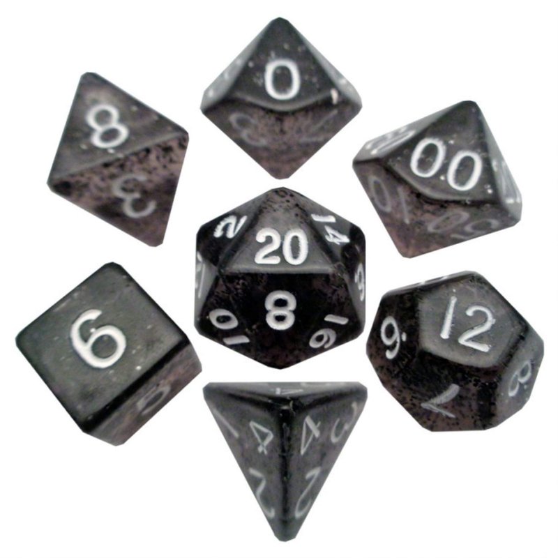- Colored ethereal black with white numbers. Contains 7 assorted resin dice.