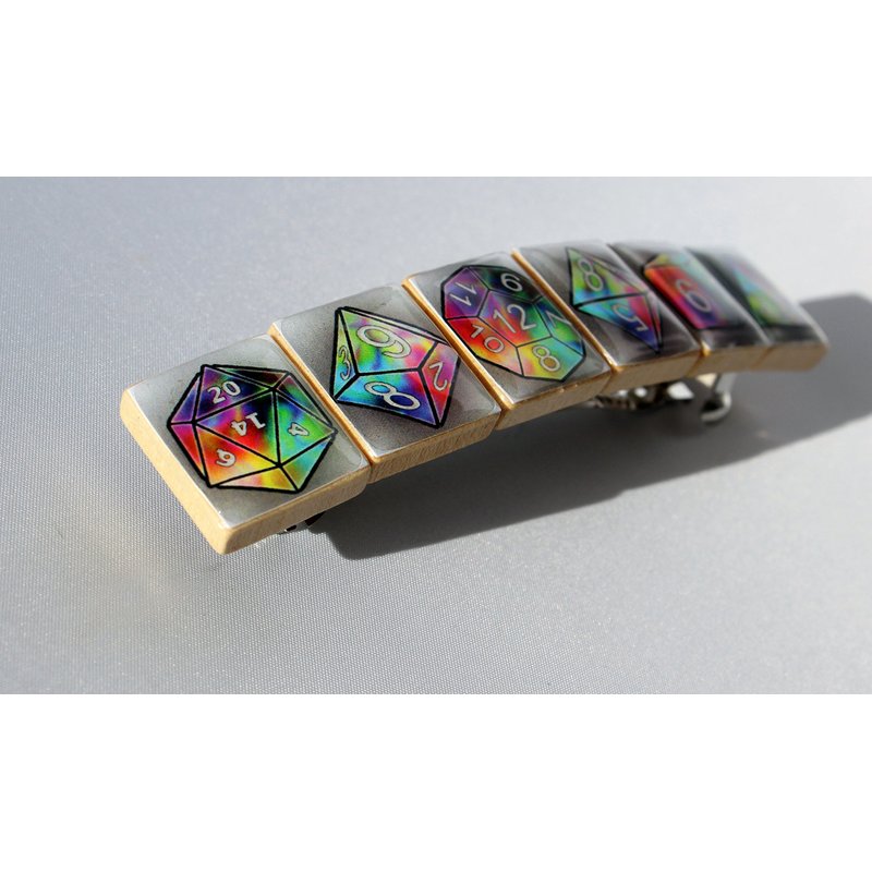 For those who dare to enter the epic world of Dungeons and Dragons, there is one accessory they cannot be without: a pack of polyhedral dice. And for those looking to keep their hair looking nice while battling skeletons, hobgoblins, and gelatinous cubes (hey, don't laugh, my brother-in-law went that way), we offer this 100mm barrette made from re-purposed Scrabble tiles. Each tile features the image of a specific die, all multicolored and sure to stand out. Custom orders are available for different colors, please allow additional production time for those.