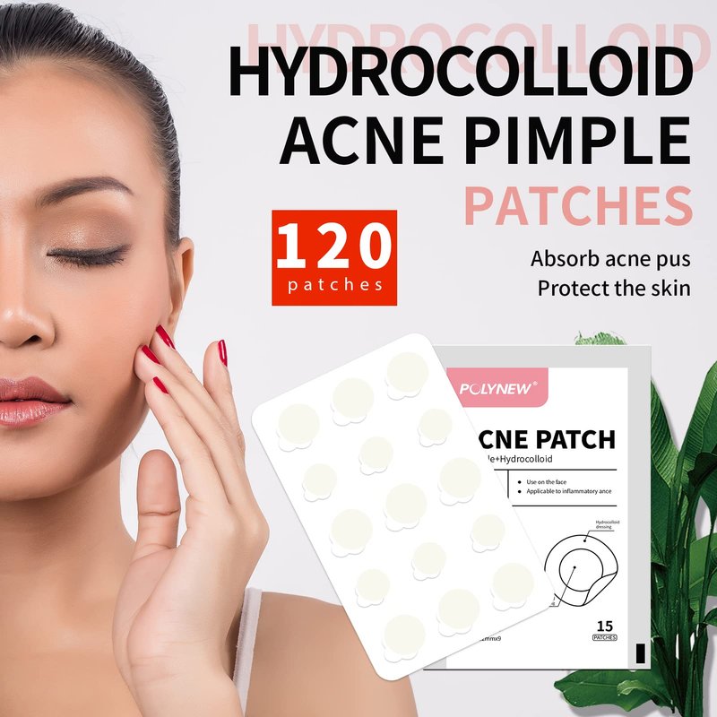 - [An unique way to cure acne pimples] Today we discovered an unique solution for treating pus acne pimples by using polynew's high quality hydrocolloid patches to cover the red and swollen areas. Hydrocolloid can absorb pus and other tissue fluid from acne pimples, and press the skin around acne to make the skin more flat after healing and create a good healing environment for the skin.