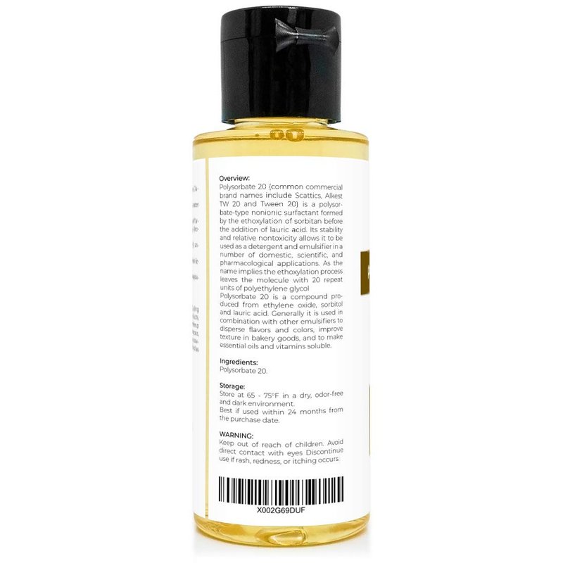 - 100% Pplysorbate 20 ( Solubilizer ) is a compound produced from ethylene oxide, sorbitol and lauric acid; Food & Cosmetic Grade; Ingredient : 100% Polysorbate Oil