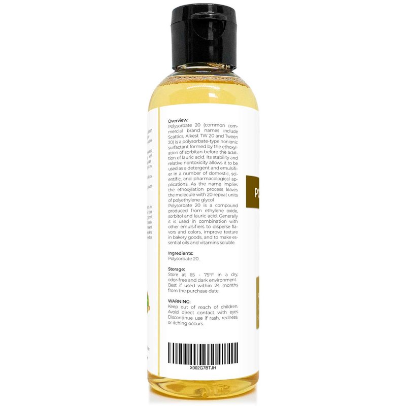 - 100% Polysorbate 20 ( Solubilizer ) is a compound produced from ethylene oxide, sorbitol and lauric acid; Food and Cosmetic Grade; Ingredient : 100% Polysorbate Oil
