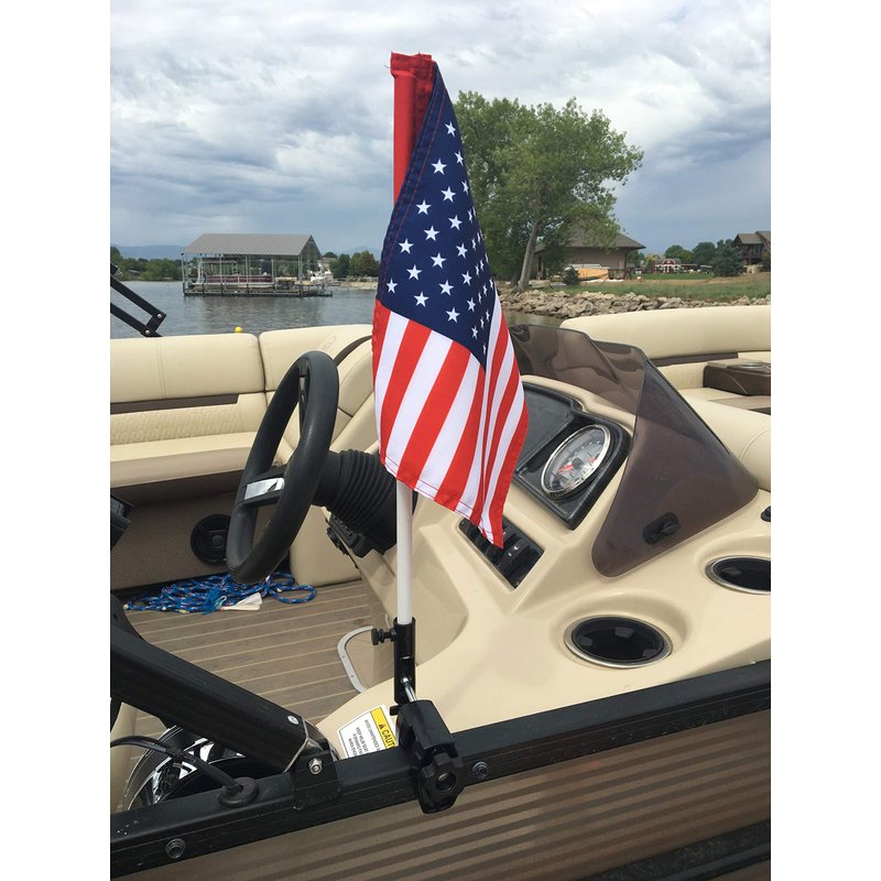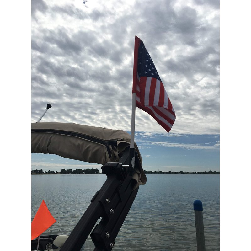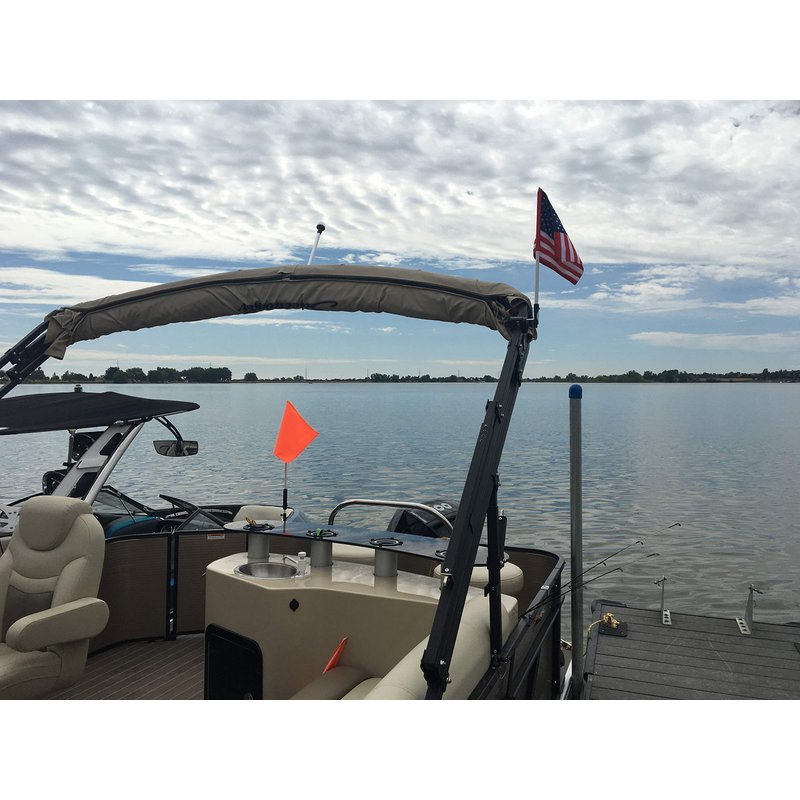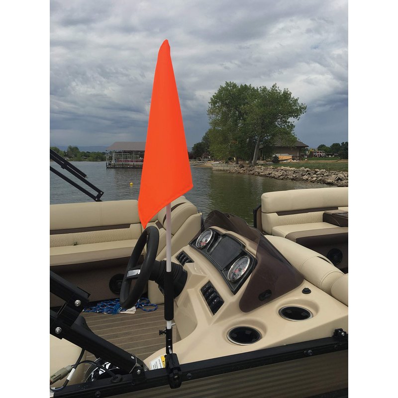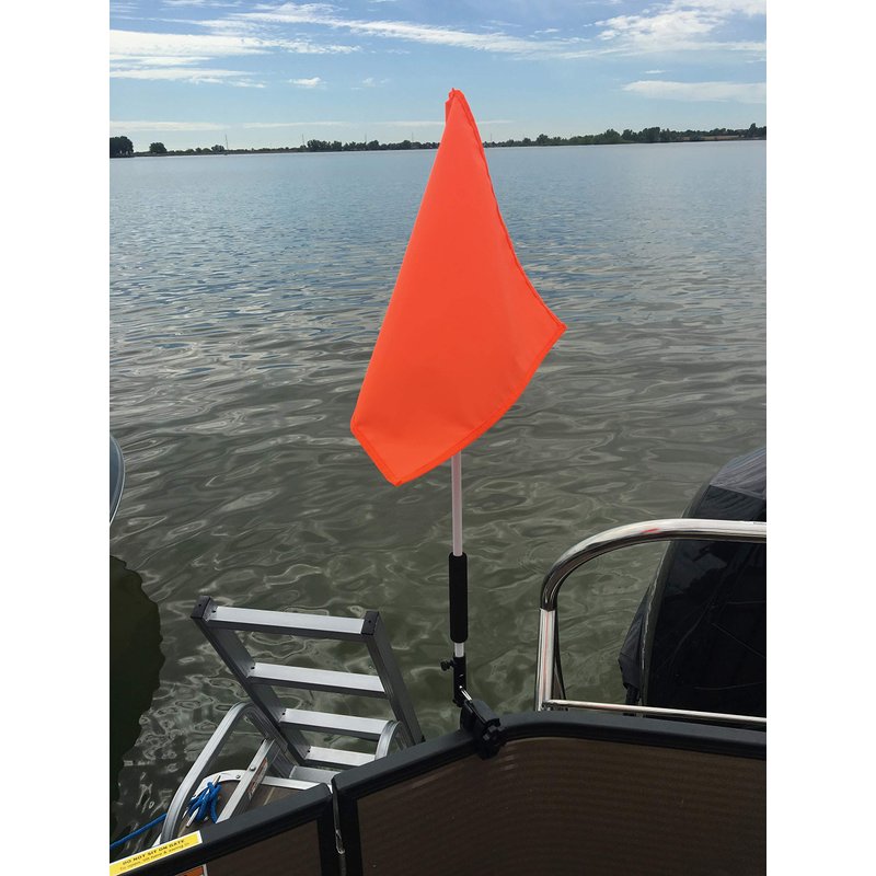 Pontoon Boat Flag Holder. Orange safety flag included. Tired of Holding the Skier Down Flag? Just clamp the Flag Buddy to your Boat and rotate it up when required. Rubbber clamping pads.