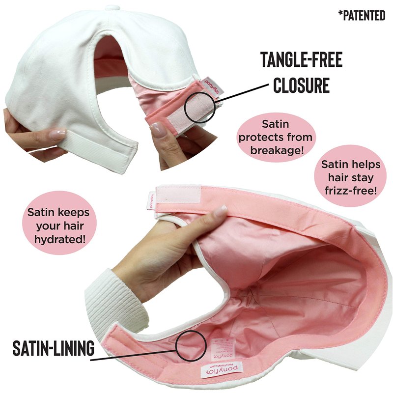 - DESIGNED FOR WOMEN: Ponyflo Satin Lined Ponytail Hats are uniquely designed from a woman’s perspective. Its distinctive tangle free closure of the cap is especially loved by women who like to wear hats with their hair up or down. The Satin Lining is designed to help prevent hair from breakage and split ends. This baseball hat is comfortable and good for your hair!