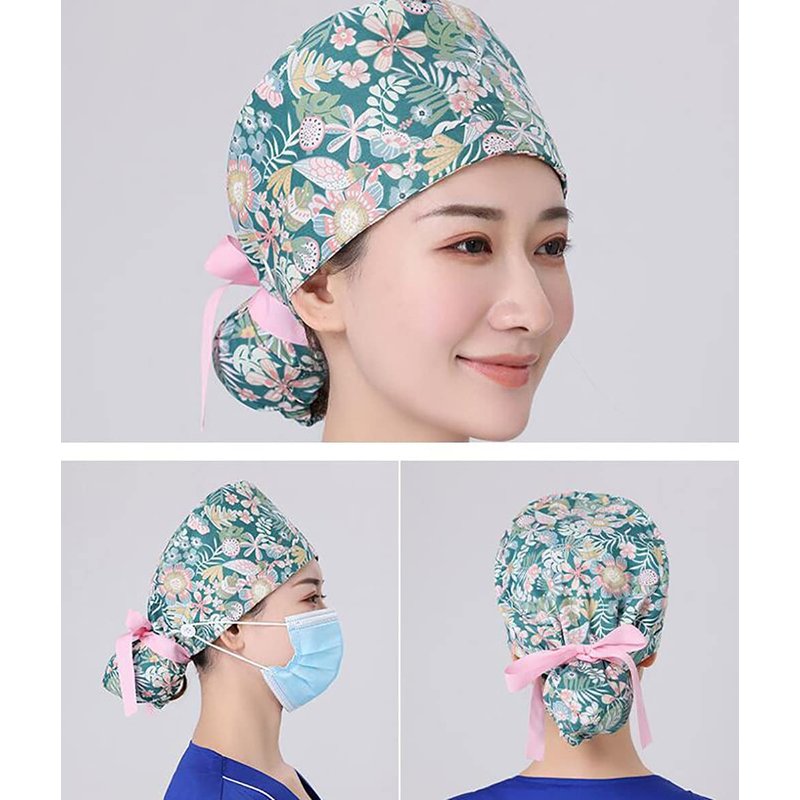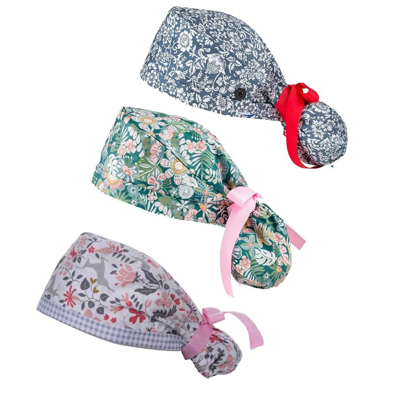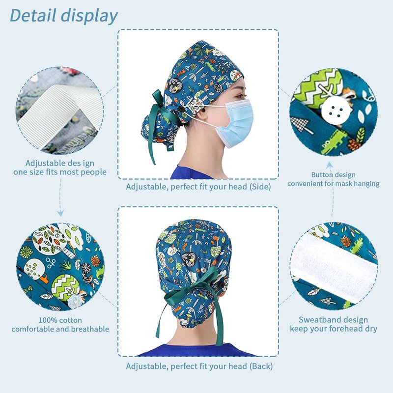 - scrub caps women [Premium Material & Adjustment] 100% high-grade cotton fabric, light, comfortable & breathable, fast dry. Style Bouffant hat have an elasticized band and ties in the back that can be worn two ways: Tied loosely in back or Tied up in a ponytail. One size