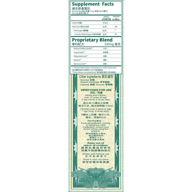 Directions for Use: Adults and children over 12 years of age: 2 tsp(10ml), 3 times daily Children over 5 years of age: 1 tsp(5ml), 3 times daily Shake well before use. Store in cool, dry place. Warning: If you are pregnant, nursing, or talking any other medication, consult your doctor before using this product. Keep out of reach of children. History In the early 1880s, Poon Goor Soe Pharmaceutical Factory of Guangzhou introduced their first-ever product, the Snake Gall Bei Oral Liquid. In just a few years, more than 200 pharmaceutical factories all over China copied the formulation and produced the same product, a blooming scene of manufacturing indeed. By employing advance technology to improve quality control, Poon Goor Soe Pharmaceutical factory commanded a leading edge over the other competitors. In Beijing , whenever people talked about Tong Ren Tang Drug Store, they will envisage Guo Gong Wine; whenever people mentioned about Poon Goor Soe, they inevitably think of cough mixture. Poon Goor Soe was practically associated with cough mixture. In Guangdong province, Hong Kong and Macau , Poon Goor Soe was already a household name. Poon Goor Soe has over 100 years of history. Sometime around 1890, Poon Bei-Shi and his brother Poon Ying-Shi both of Kaiping county, Guangdong province, established Chang Chun Dong Drug Store at Gao Di Street, Guangzhou city, where they employed over ten workers and ran a small-scale drug manufactory at the back room of the store. Apart from selling their pills to various parts of Guangdong province, they also exported their products to Peru , Thailand and South East Asia . In 1920's, when the business was booming, the Poon brothers passed away one after another. Chang Chun Dong was later ran by Poon Bei-Shi's son Poon Yi-Liu and Poon Ying-Shi's son Poon Chu-Chi. Soon both of them left to venture into other business. The store was then taken over by Poon Bei-Shi's fourth son Poon Yu-Sheng. The Guangzhou Uprising broke out a sh