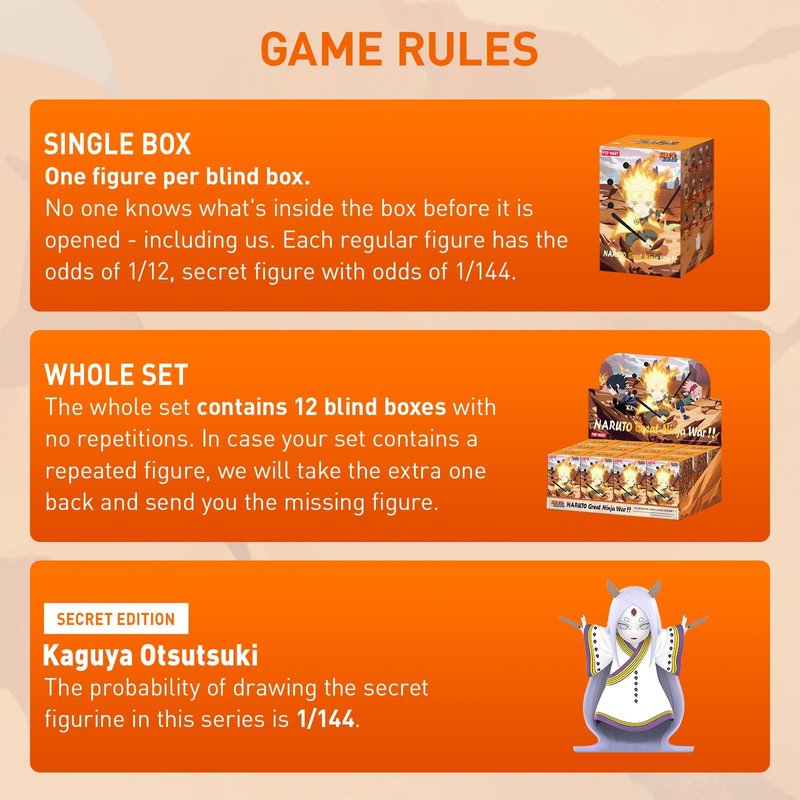- POP MART NARUTO Ninkai Taisen Series Figures: The blind box contains a random figure from a specific series. Each blind box only contains one figure. No one, including us, knows what's inside. This collection contains 12 blind box figures, one of them might be the secret edition.