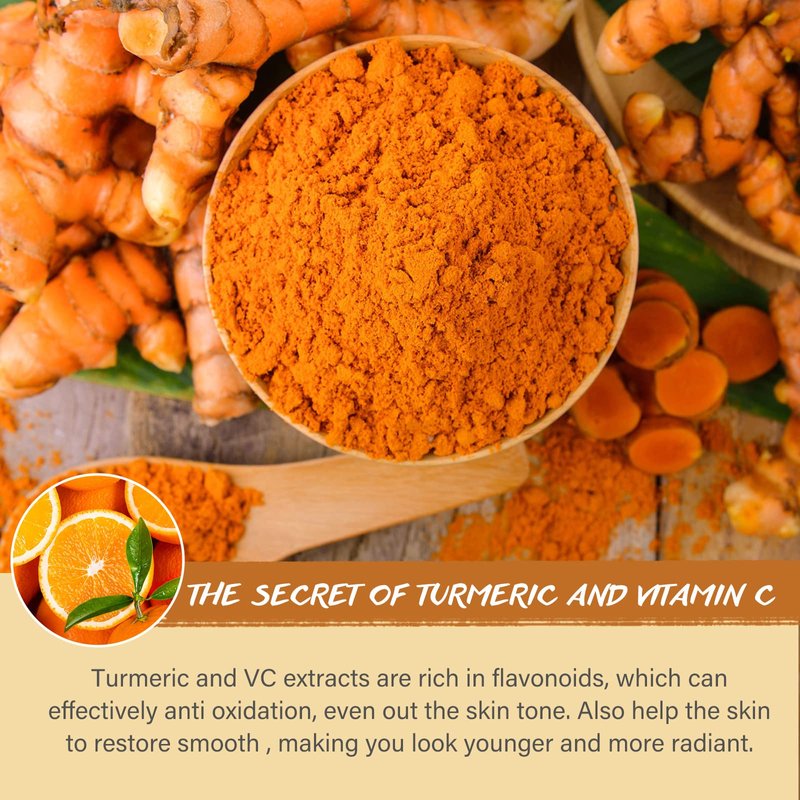 - VITAMIN C AND TURMERIC: Organic turmeric and vitamin C are rich in antioxidants that reduce melanin deposits, stimulate collagen production, even out skin tone, improve dull skin, and restore your youthful radiance.