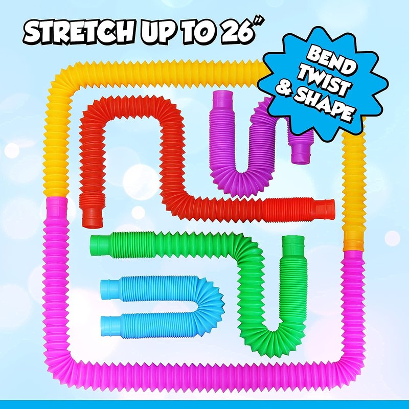 - WHAT YOU GET: With every pack of Tobu Pop Fidget Tubes you purchase, you will receive 4 different colored tubes, each measuring 7.5" when closed and stretches up to 26"! Those tubes are cool and fun to play around with and it will give you hours of entertainment creating all different types of shapes, letters or just fidgeting around with them can keep you occupied.