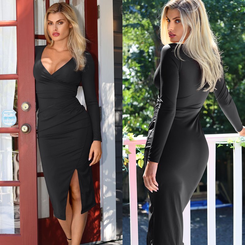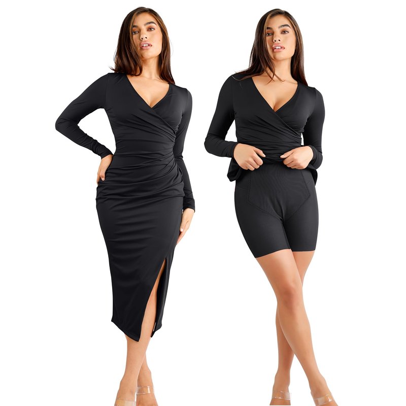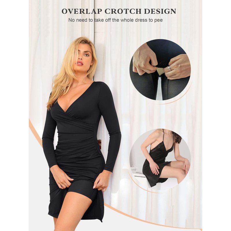 - 【NOBLE AND ELEGANT APPEARANCE STYLE】:This cocktail shapewear dress is made of high-grade fabrics, and the overall texture looks very classy and elegant. The V-neck design of the black bodycon dress leaks out the shoulder and neck, elongates the neck line. The overlapping chest design expands the chest and makes the waist appear thinner visually. The back shape mesh design of the long sleeve dress creates a more elegant back line, making you look classy and charming;