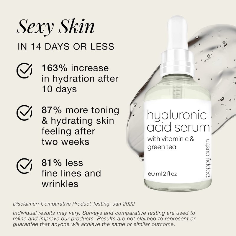 - Ultra Hydrating Face Serum - The secret to more radiant skin is providing it with the much-needed hydration. Poppy Austin's pure hyaluronic acid serum for face helps moisturize your skin from the outer to the deeper layers, delivering instantly dewy and glowing skin. It's formulated with the highest quality ingredients, including pure, vegan 5% hyaluronic acid, vitamin c, and green tea, reviving your face with skin-saving antioxidants while protecting it from free radicals.