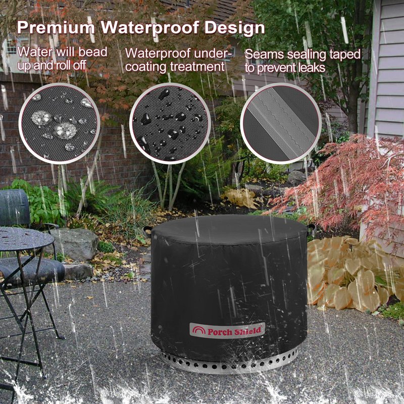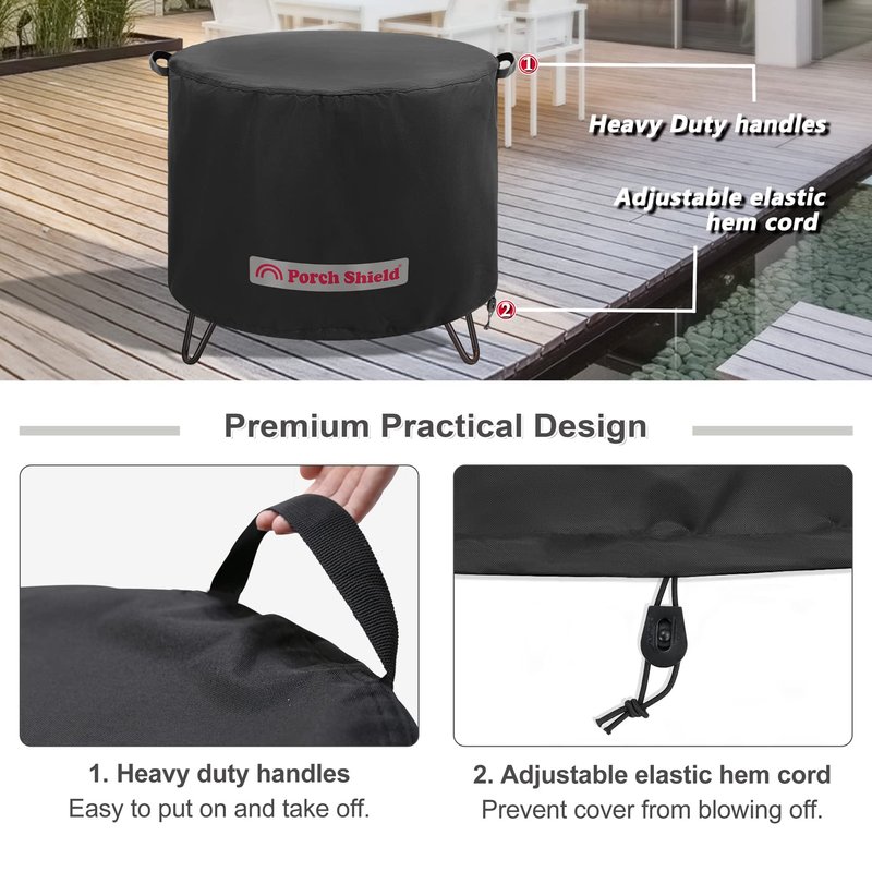 1. Made of solution-dyed 600D Polyester fabric with waterproof undercoating. Thicker than most of fire pit covers in the market.