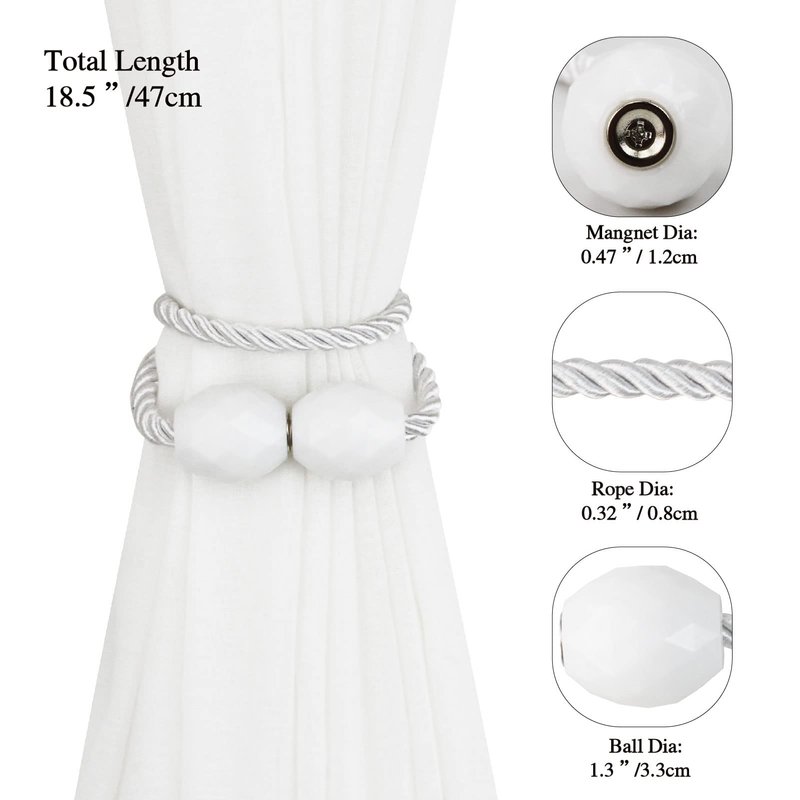 - Beautiful magnetic curtain tie backs, Total Length - 18.5", Rope Diameter- 0.3". Could be twisted to adjust the length to meet your need, You can wind it twice or use it directly. so no need to worry about the size being too big, suited for thin curtains, sheer curtains, and thick shower curtains. You can refer to the various bundling methods shown in our pictures.