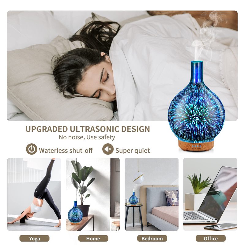 - UNIQUE ART DECORATIVE DESIGN - Our 100ml glass essential oil diffuser has a firework 3D effect glass cover and wood grain decorative base. It is very suitable for your bedroom, living room, children's room, study room, office, and yoga room.