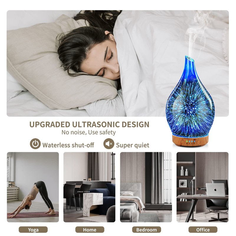 - UNIQUE ART DECORATIVE DESIGN - Our 100ml glass essential oil diffuser has a firework 3D effect glass cover and wood grain decorative base. It is very suitable for your bedroom, living room, children's room, study room, office, and yoga room.