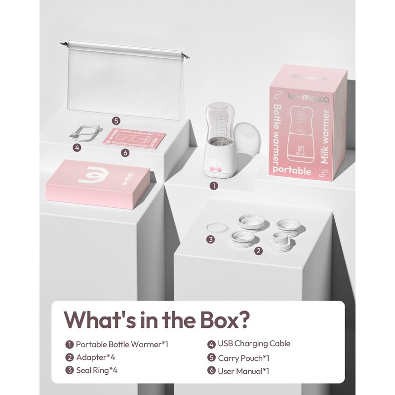 Portable Bottle Warmer, w-maxa Fast Baby Bottle Warmer for Travel with Glass Bottle & 4 Adapters, Rechargeable Bottle Warmer On The Go with Precise Temperature Control for Breastmilk, Formula