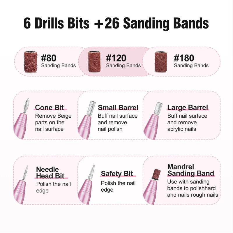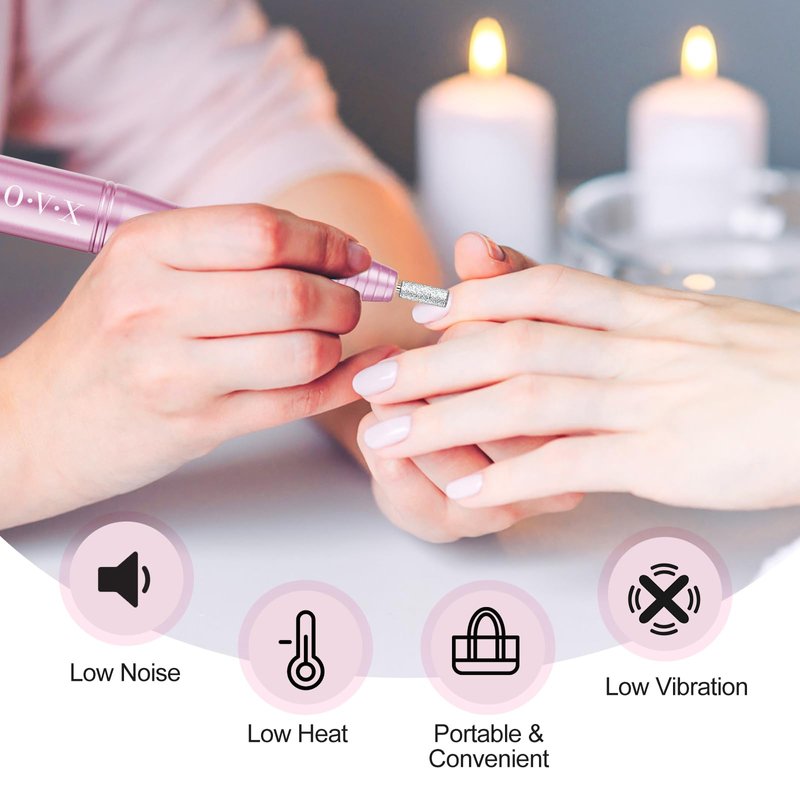 - Professional Nail Drill Kit - Designed with 6 optional standard metal bits, 26pcs sanding bands and nail art brush,which are suitable for grinding, carving, cutting, polishing for all nail arts as well as cuticle removal.Our OVX perfect kit will save you time and help you make a beautiful nail.