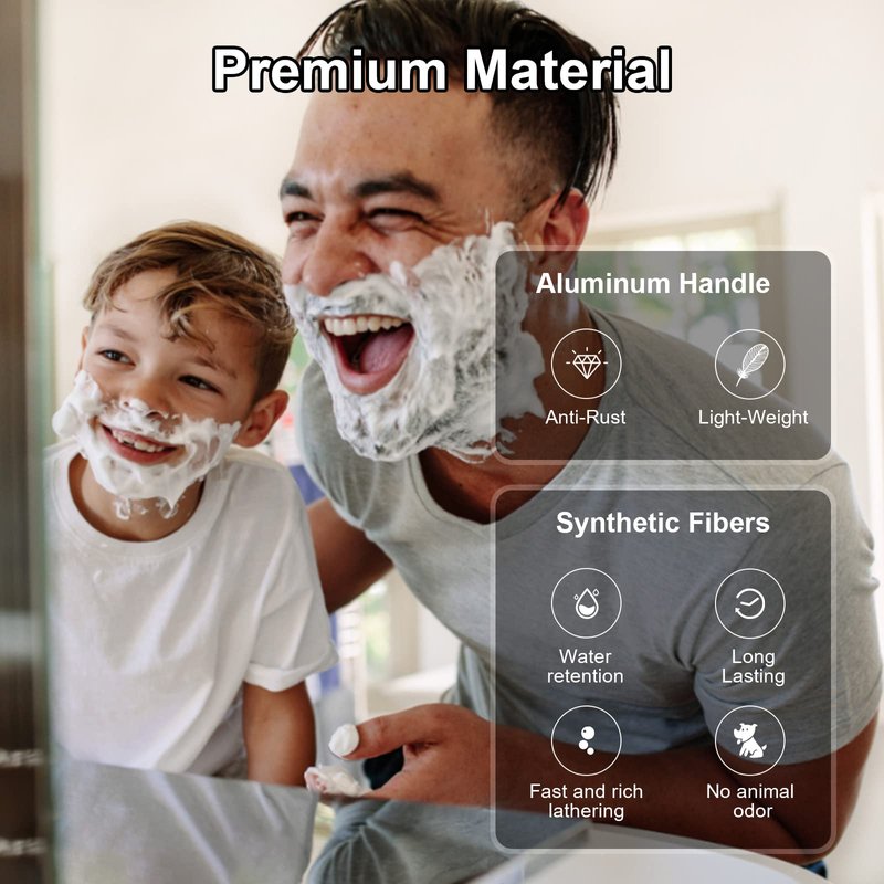 - Synthetic Brush Hair - Premium synthetic fiber is durable and has no animal odor. It makes creamy lather just as other fancy big brushes.