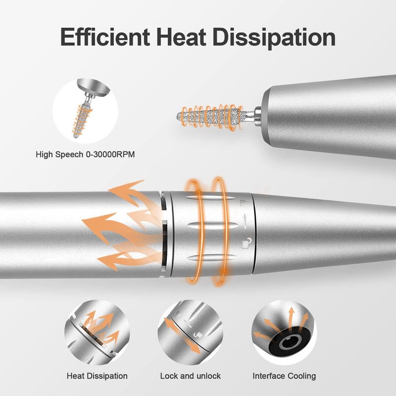 The handle and interface of the electric nail drill have cooling holes for quick heat dissipation. Low heat, low vibration, low noise, long-term smooth operation, easy and safe to use, don't worry about affecting others. Both professionals and beginners can easily master it!