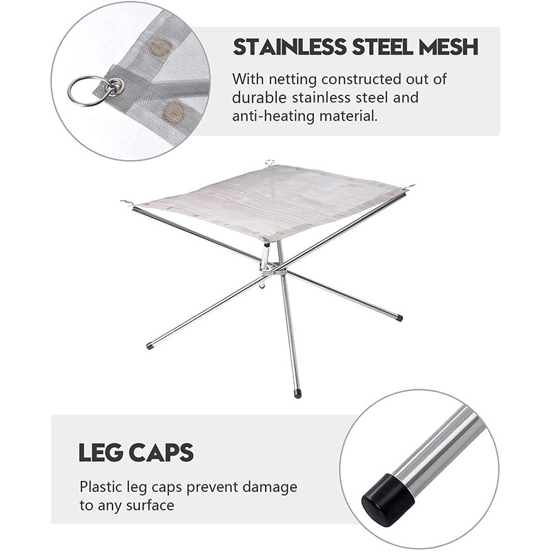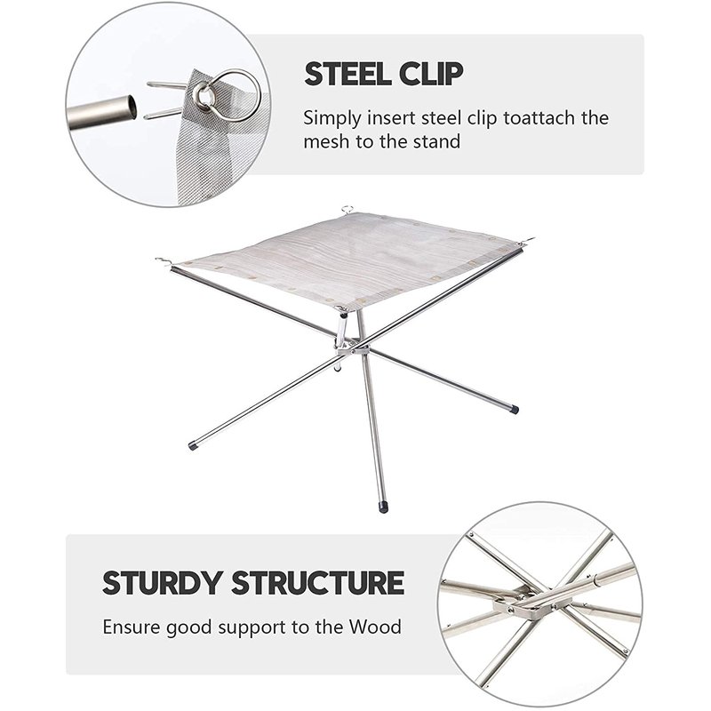 The anti-heating and durable stainless steel material can hold enough wood for fires of all sizes. It is easy to clean up. After the ash was cool, just dumped it in the trash and wash of the mesh. It can assemble in minutes with no tools required, and collapses quickly into the 9.5" x 3.6" x 3.6" carrying bag.