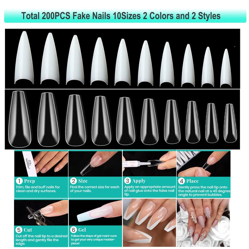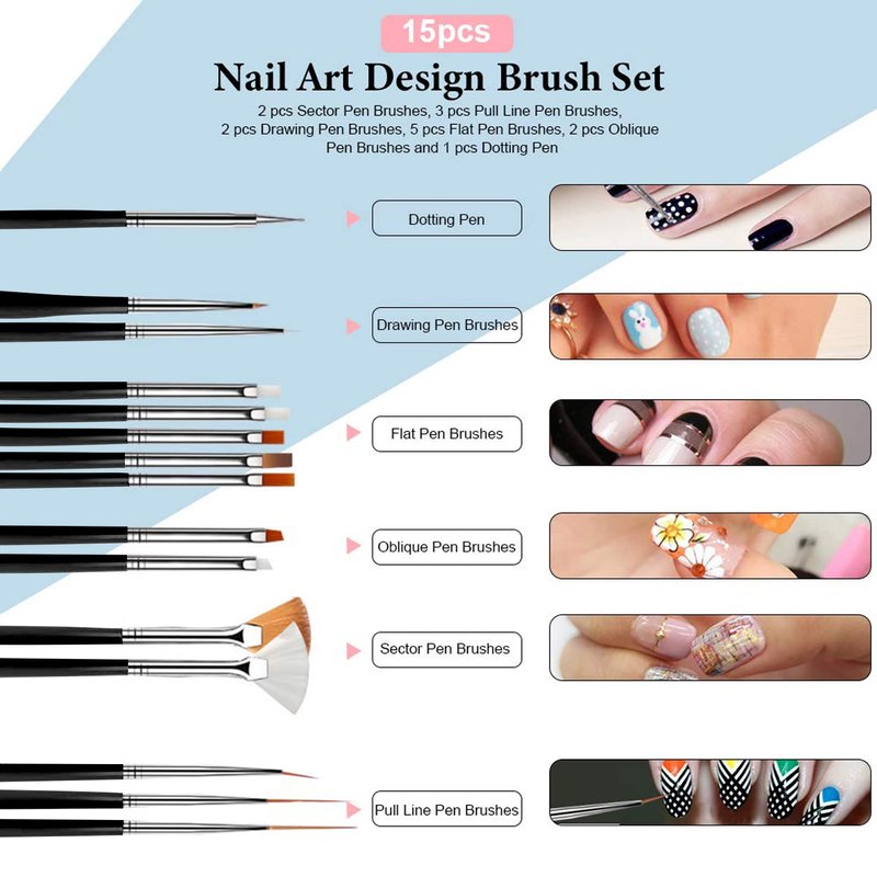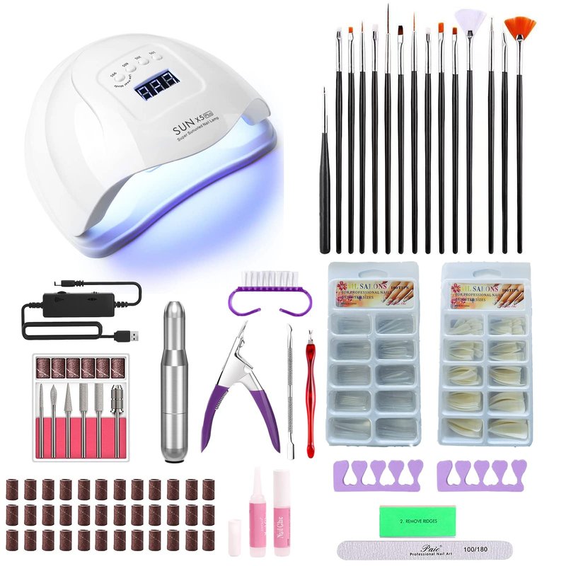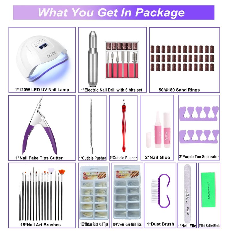 - 【Professionals Acrylic Nail Art Kit】This Nail Acrylic Manicure Art Tool Starter Set can be used for beginners or professionals: 120W UV LED Nail Lamp *1,Electric Nail drill*1 with 6 nail bits and 6 pcs Sander rings,Nail Art Brushes*15,200Pcs False Nail Tips,Nail Buffer Block*1,Dust Brush*1,Nail Files*1,Purple Toe Separator*2,180# Sanding Rings*50,Cuticle Pusher*2,Cuticle Pusher*2,Nail Glue*2, Nail Clippers*1.Whether you are beginner or professional, this acrylic nail art set is perfect for you