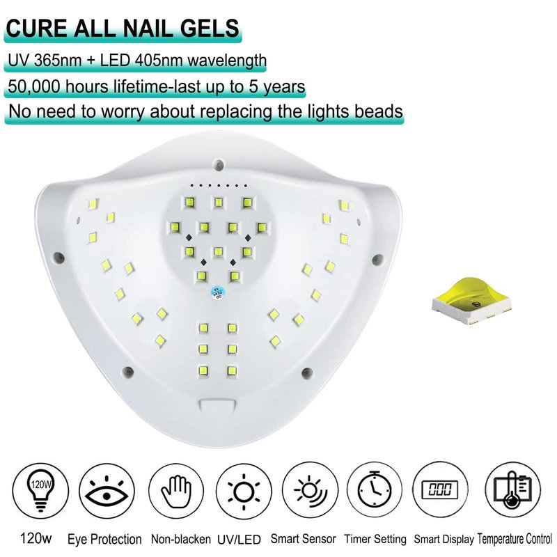- 【120W UV LED Nail Lamp】Powerfully and Efficiently, 120W High Power LED nail lamp has 36 quality LEDS that can maximally save your 80% curing time. 4 Timer Settings-10S/30S/60S/99S durable and easy to use.(Boot default 120S)Innovative painless low heat, makes you feel comfortable during curing nails. It can perfectly cure all kinds of UV/LED based gel products, no worry for curing hard gel/builder. With smart auto sensor and screen also allows you to see the timer clearly.