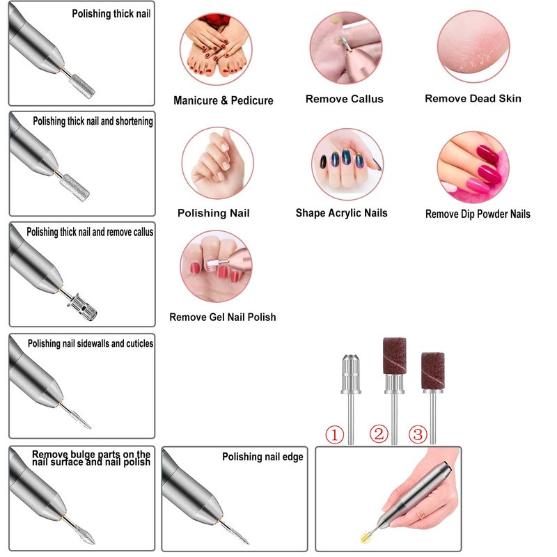 - 【Adjustable Speed Professional Nail Drill Set】The electric nail drill machine set with 6 different nail drill bits,6 sanding bands.It can be used for manicure, grinding, carving, cutting, polishing for all nail arts as well as cuticle removal and so on.Flexible forward/reverse switch is suitable for both hands use, and the speed with a precise sliding control is adjusted from 0rpm to 20,000rpm, making you use it at ease.Lightweight and portable, you can take it anywhere.