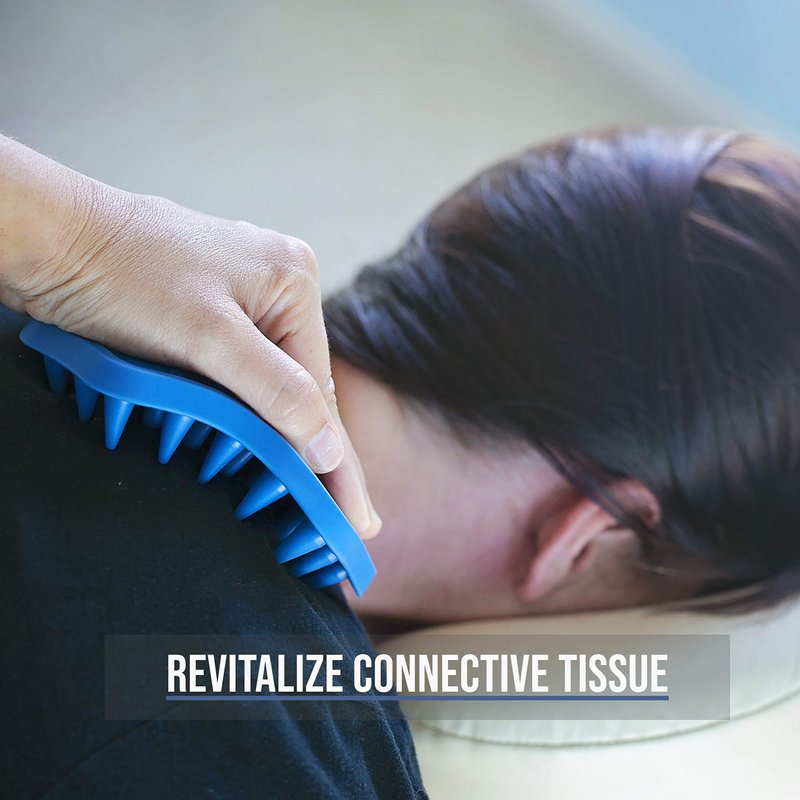 Introducing the POSTURE PREP self-massage therapy brush- a handheld massaging tool designed by a chiropractor to offer manual deep-tissue stress and pain relief.