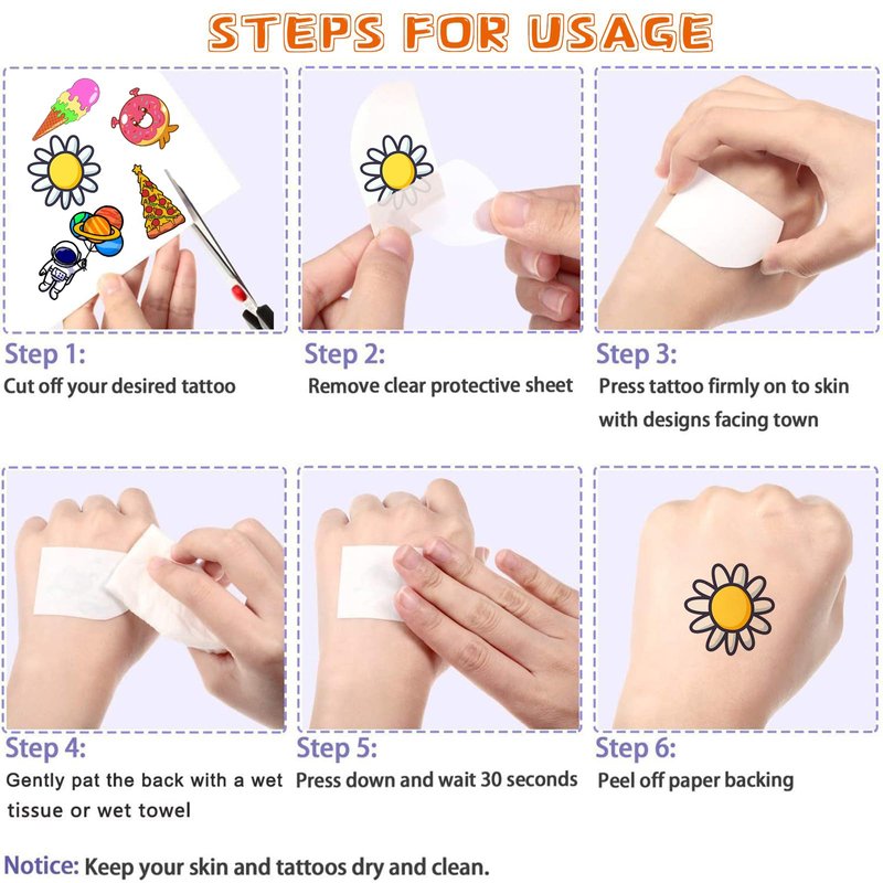 Easy to Use and Remove: Cut out the desired motif, rub the back of the tattoo with a damp cloth or sponge for 30 seconds. Simply soak the tattoo with baby oil or olive oil alcohol and remove the tattoo after a few minutes.