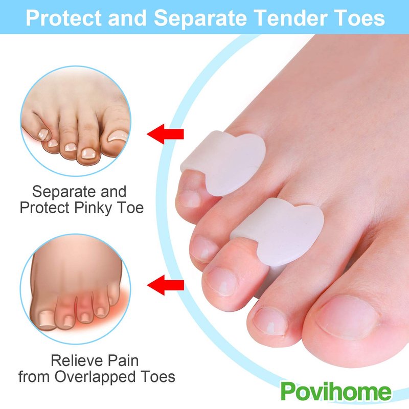 - If you need a small spacers to separate or protect pinky toe (or small toes), Povihome toe pinky toe spacers are right for your need. Pinky toe separators create some distance between the adjacent toes and ease toe pain from overlapping toe, blister, corn and eliminate the possibility of the shoe rubbing the toes.