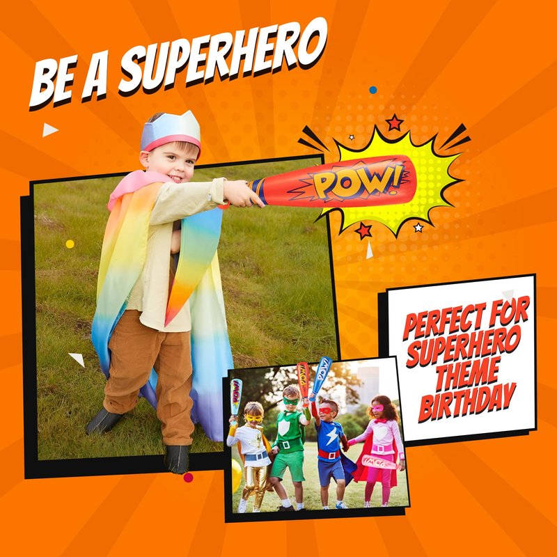 - STAYS INFLATED! HIGH QUALITY: Bedwina inflatable bats superhero bats are awesome high quality made from nice and thick vinyl material and feature bright vibrant colors that kids enjoy. The baseball bat balloon stay inflated and your kids will love them