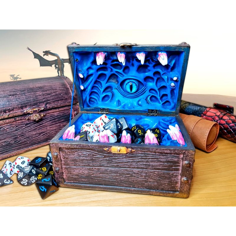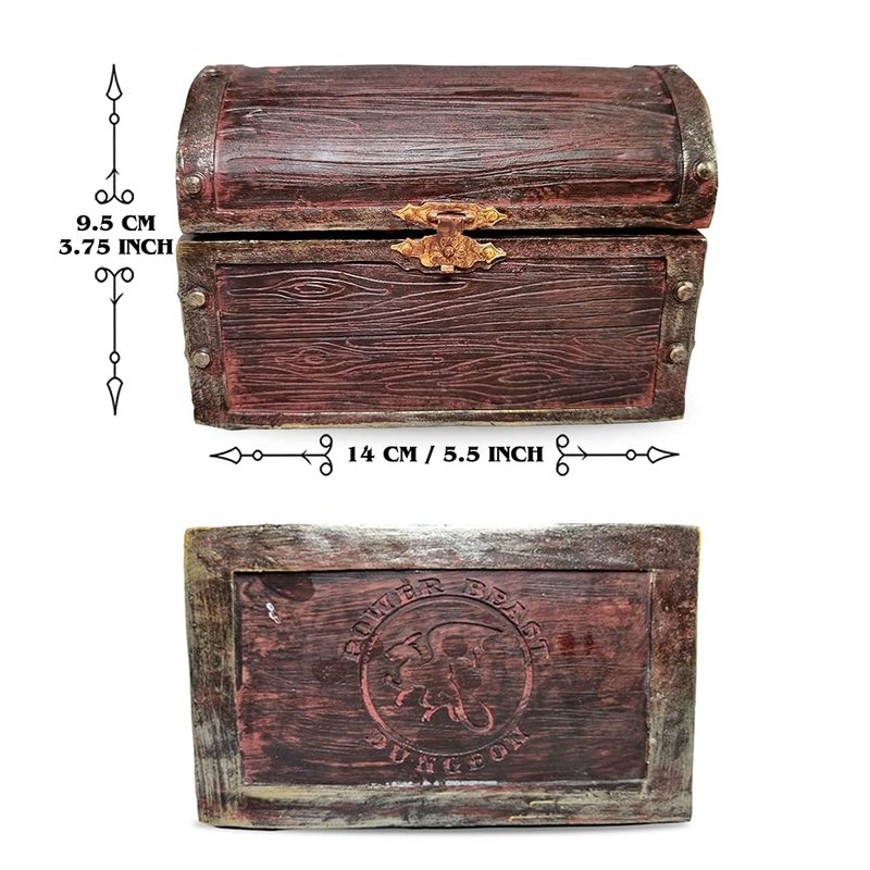 - 🐉 MIMIC CHEST POWER BEAST DUNGEON: This Mimic chest is handmade and hand painted, taking care of every detail, it comes in a box with several protection systems to ensure a delivery in perfect condition. The eye of Mimic is made of glass, giving it an incredibly realistic look. It looks like a normal treasure chest, but when you open it, the Mimic will show its teeth and its cold stare! Use it not only as a container for dice, but for tokens, miniatures, and much more!