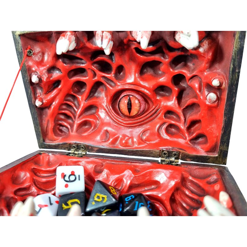 - 🐉 MIMIC CHEST POWER BEAST DUNGEON: This Mimic chest is handmade and hand painted, taking care of every detail, it comes in a box with several protection systems to ensure a delivery in perfect condition. The eye of Mimic is made of glass, giving it an incredibly realistic look. It looks like a normal treasure chest, but when you open it, the Mimic will show its teeth and its cold stare! Use it not only as a container for dice, but for tokens, miniatures, and much more!