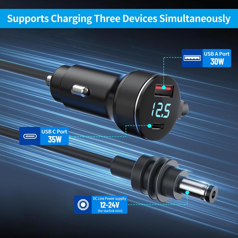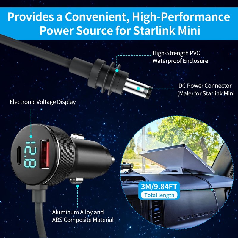- 【Reliable Power for Starlink Mini in Vehicles】Designed specifically for Starlink Mini and its accessories, this cable ensures a stable 12.8V-24V power supply for cars, trucks, RVs, ships and boats. The DC plug is a dedicated connector—do not use it with other devices to prevent potential damage. Featuring USB-C PD 140W and USB-A QC 35W ports, it is recommended to avoid charging other devices simultaneously while powering the Starlink Mini to maintain optimal performance.