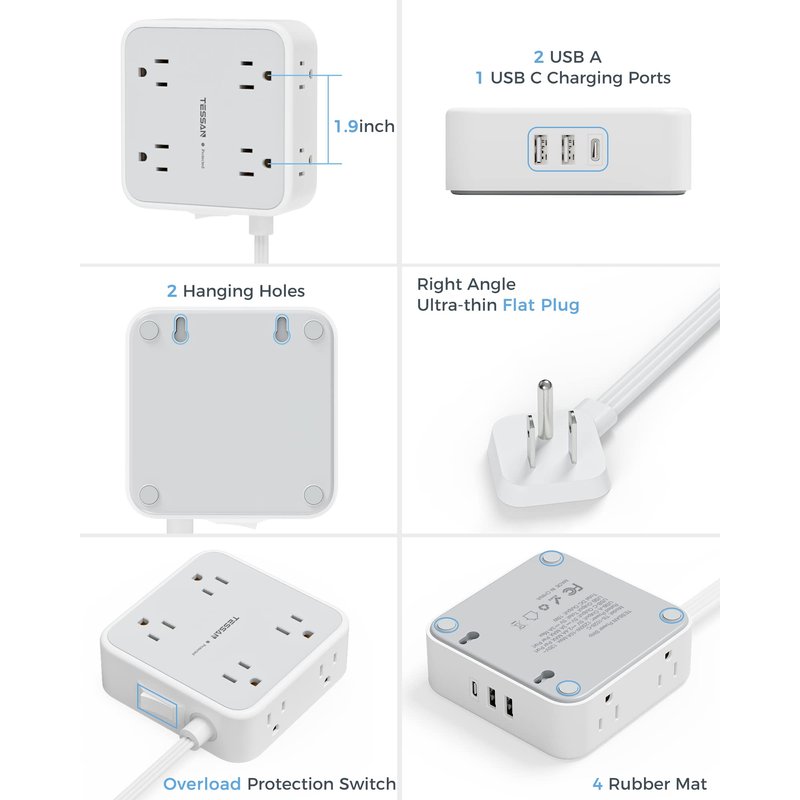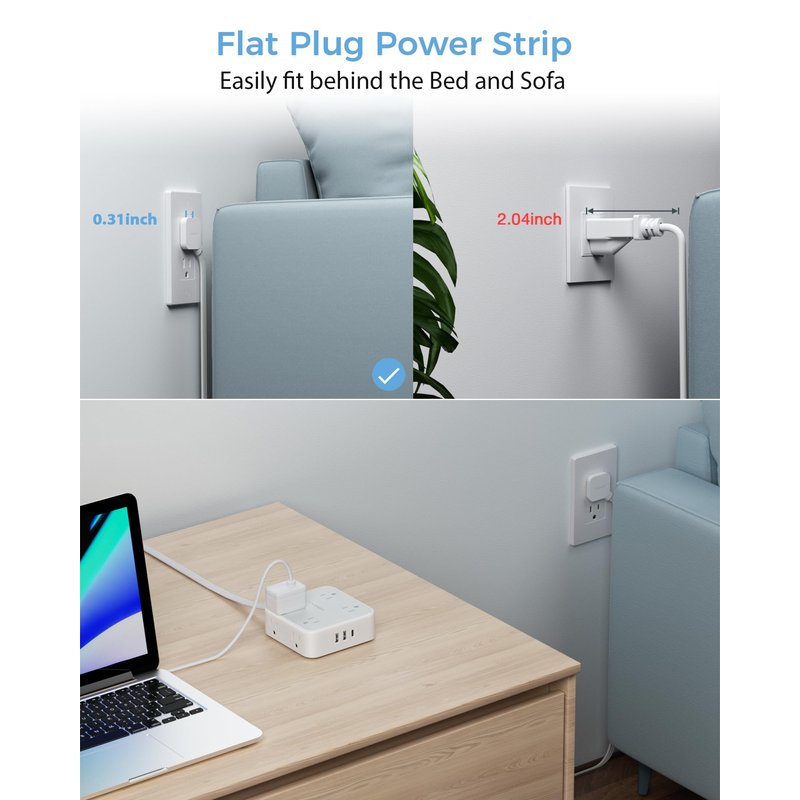 - Flat Plug Power Strip: With only 0.31 inch ultra thin flat plug design design helps you save space and avoid clutter, making it easier to position the power strip in tight spaces.
