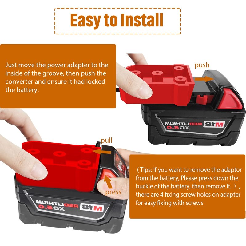 - Easy to Install: Just move the power adapter to the inside of the groove, then push the converter and ensure it had locked the battery. ( Tips: If you want to remove the adapter from the battery, Please press down the buckle of the battery, then remove it. ), there are 4 fixing screw holes on the adapter for easy fixing with screws.